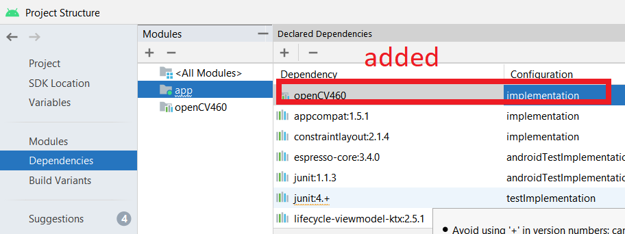 1) remove the "app" dependency in the application the OLD module associated with an OLDER OpenCV Project Structure dependencies
