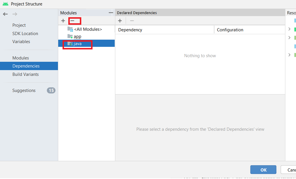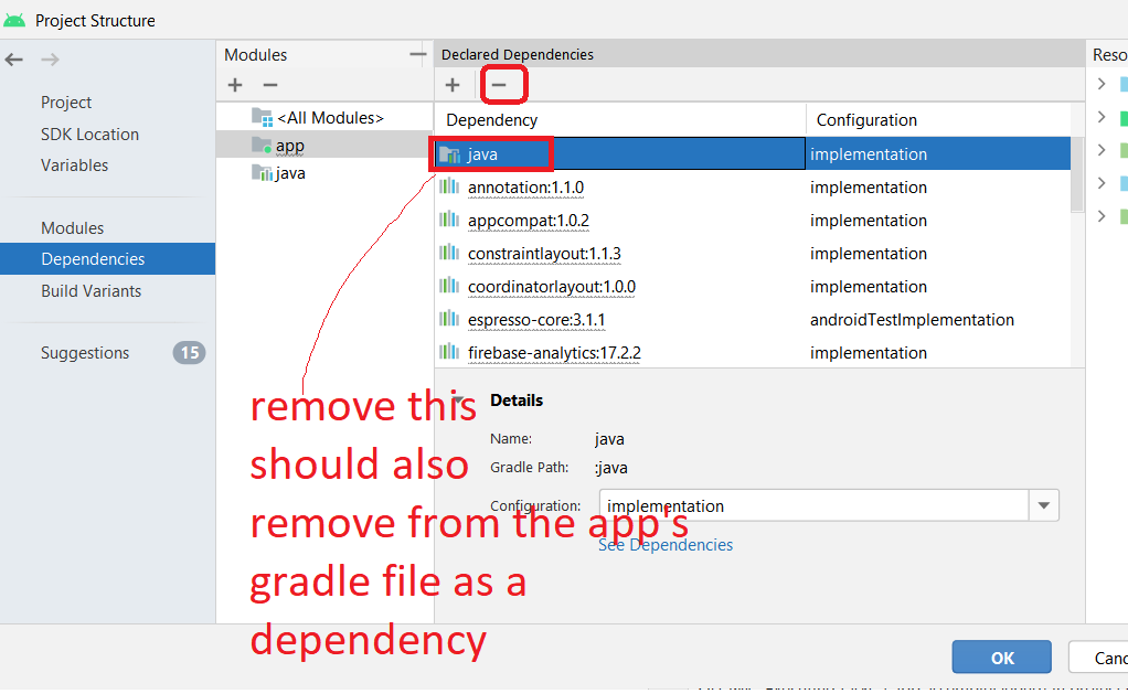2) remove the OLD OpenCV module (this is a stupid name "java" given to this OLD openCV module --yours may be different you will have to know that)