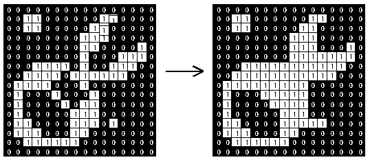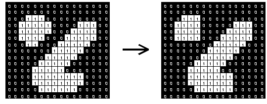 - this means that wherever a pixel in the image can be contained inside of an overlapped struturing element mask and all of the other pixels inside of the sturturing element mask are also set to 1, than this pixel is retained and not eroded. Otherwise, the pixel is eroded.