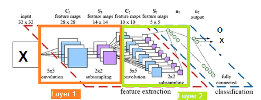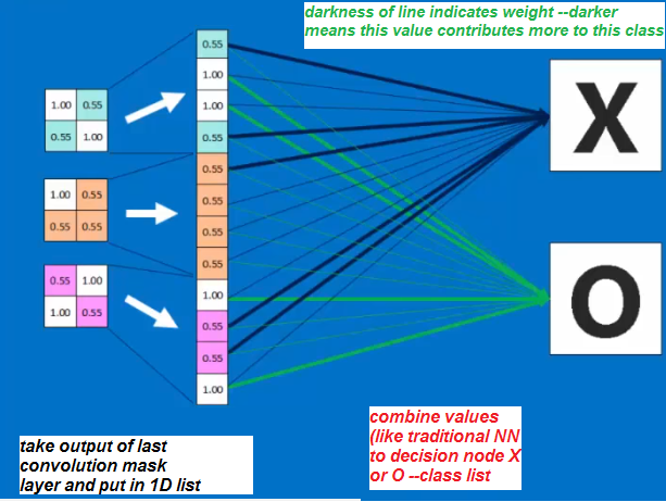 HERE is another possible smaller CNN for our problem- 3 Layer example --2 layers with convolution masks and the last layer is fully connected nodes yielding decision X or O