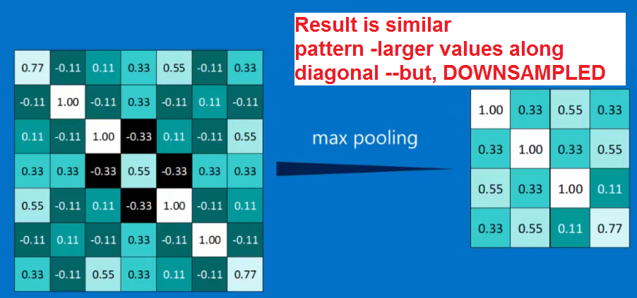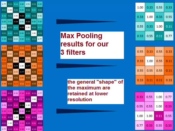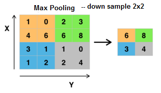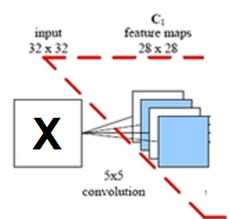 << example where input image 32x32 pixels and have THREE MxM filters convolve with yielding 6 times data. Note here MxM =5x5 and we can not convolve with the first 2 and last 2 rows and columns (boundaries of image) --> so get THREE 28x28 size data values ---- YIKES bigger --- I want the output 2 have 2 nodes "X" and "Y". What am I going to do??? --> CNN does downsampling at each layer called Max Pooling