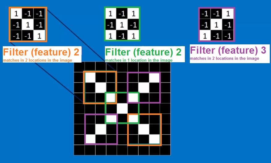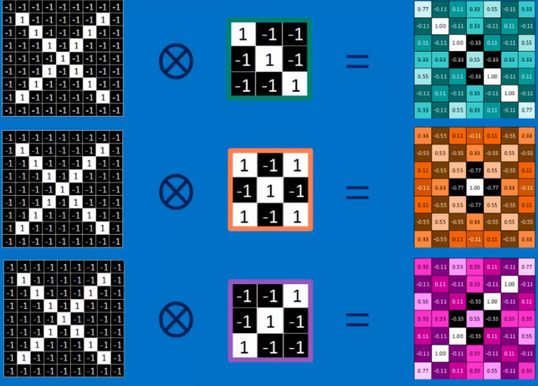 These MxM filters/masks are applied convolutionally at each layer in our CNN - in the case of our input image we apply this at each raw input pixel (at each red, green, blue if color) and we can apply only 1 MxM filter or could have multiple filters like shown above the case is 3 -- in our binary image input this would result in 3 times the amount of input data for the 3 images.......