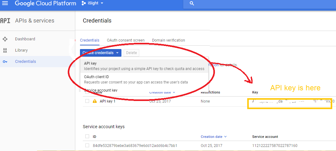 create service account, a service account key and set the key as our default credentials.type in the Google Cloud Console once you are logged in >>>>>to get to console hit the icon for it in navigation bar <gcloud iam service-accounts create vision-quickstart; \ Here is example of me running this and the name of the service account is vision-quickstart for my project id isight-2018