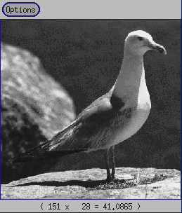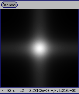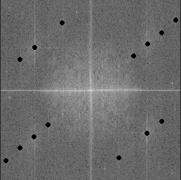Observe that in the magnitude spectrum we can identify coherent noise, "stars" of different sizes. Our objective is to eliminate this noise pattern by making those "stars" equal zero. Displayed below is a pattern that we can use to multiply in the frequency domain and cancel the noise. Pass the mouse over the magnitude spectrum of the image to determine the coordinates of the spikes and create your frequency mask accordingly.