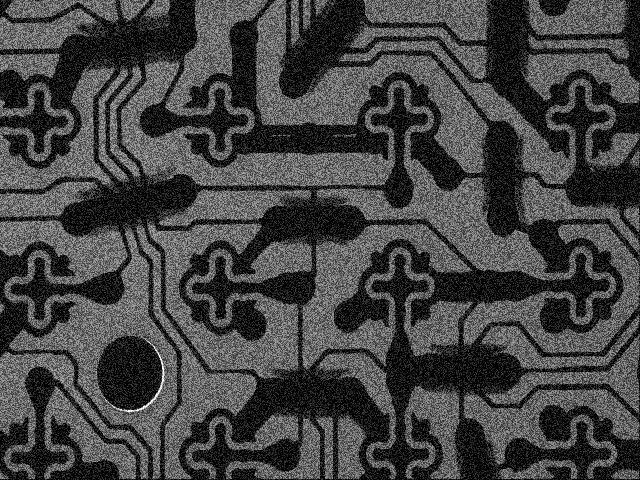 If it is possible to issolate a region of the image that should have a uniform grey level, e.g. the black background in the upper right corner, and the noise is uniform and constant, then the amount of noise can be measured. The variation then of the pixel values in this region is direct result of the noise. Noise can be characterized by:m = mean std = standard deviation