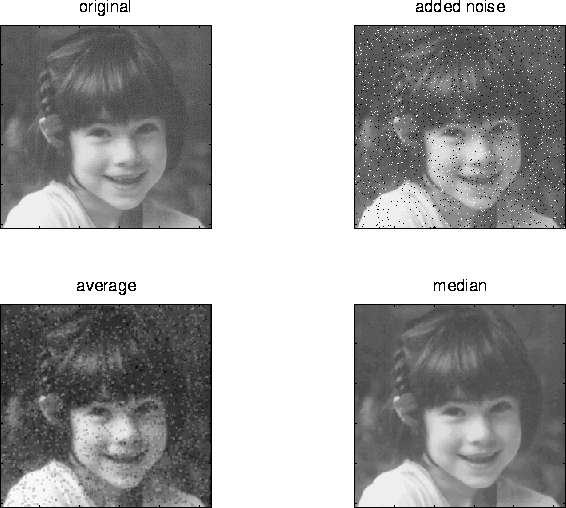 Figure:Original image, w/ salt&pepper noise, result after averaging/smoothing filter, result after median filter.