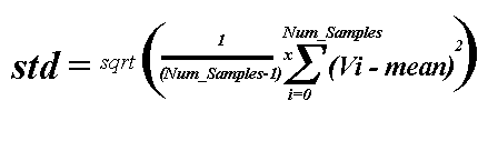 The mean is the average value of the noise signal whereas the standard deviation is the square root of the variance. Given a set of values Vi, the following are calculations: where sqrt stands for the square root.