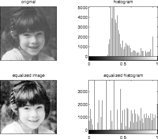 Histogram equalization is a common technique for enhancing the appearance of images. Suppose we have an image which is predominantly dark. Then its histogram would be skewed towards the lower end of the grey scale and all the image detail is compressed into the dark end of the histogram. If we could `stretch out' the grey levels at the dark end to produce a more uniformly distributed histogram then the image would become much clearer.
