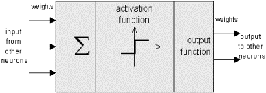 As you can see, an artificial neuron looks similar to a biological neural cell. And it works in the same way. Information (called the input) is sent to the neuron on its incoming weights. This input is processed by a propagation function that adds up the values of all incoming weights. The resulting value is compared with a certain threshold value by the neuron's activation function. If the input exceeds the threshold value, the neuron will be activated, otherwise it will be inhibited. If activated, the neuron sends an output on its outgoing weights to all connected neurons and so on.