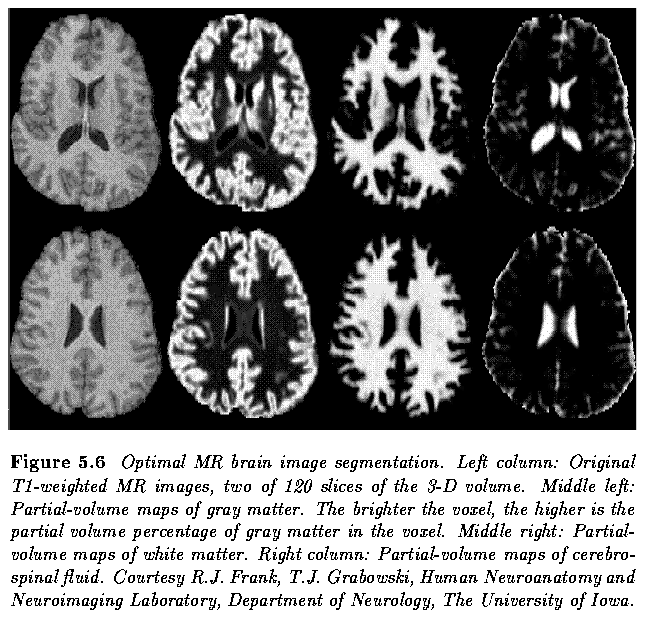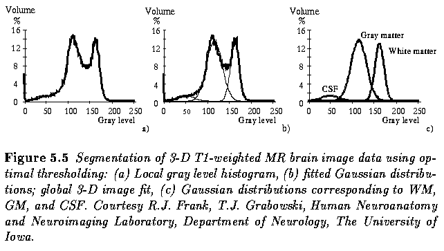 - gray-level distributions corresponding to n individual (possibly non-contiguous) regions are fitted to each local histogram that is modeled as a sum of n Gaussian distributions so that the difference between the modeled and the actual histograms is minimized