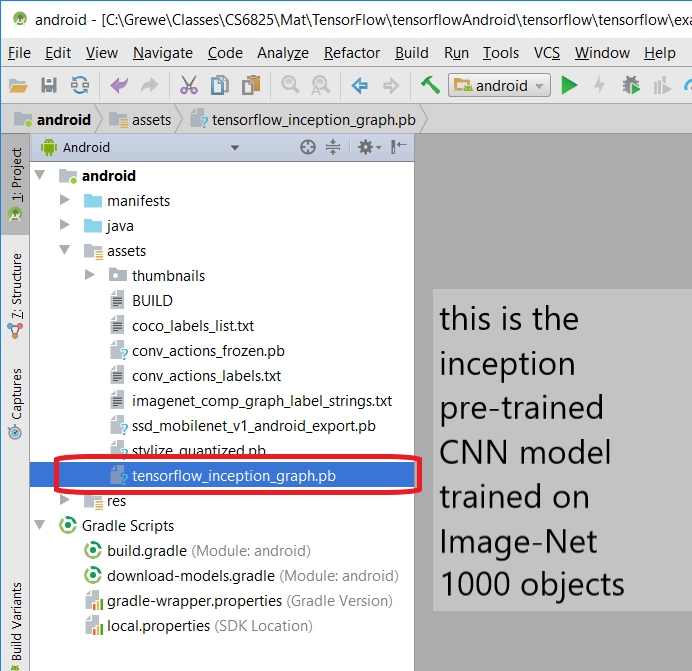 - TF Detect: Demonstrates an SSD-Mobilenet model trained using the Tensorflow Object Detection API introduced in Speed/accuracy trade-offs for modern convolutional object detectors to localize and track objects (from 80 categories) in the camera preview in real-time.
