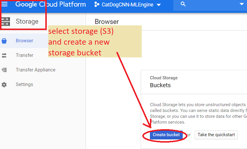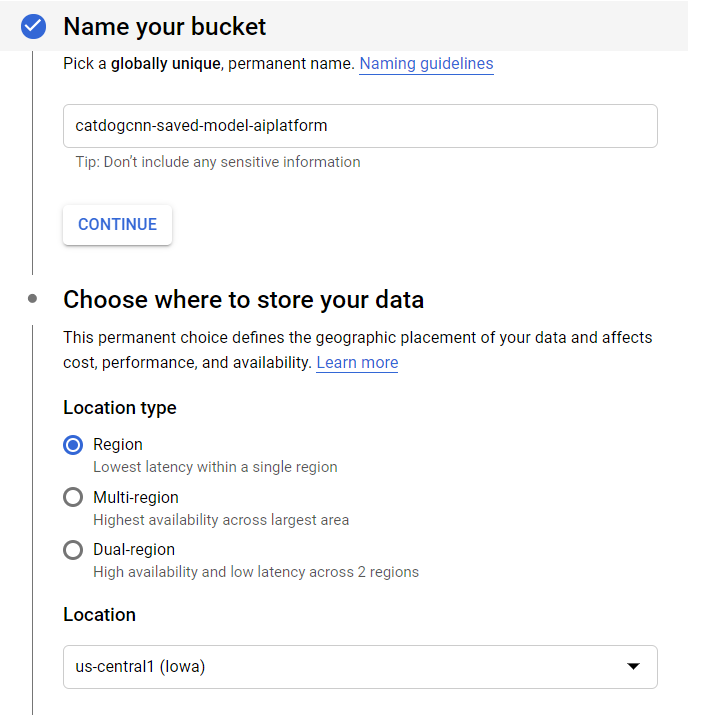 STEP 2: In your project enable the AI platform and then go to Storage and create S3 (storage) Bucket --give it a meaningful name and upload the directory of your Tensorflow SavedModel : fill out name, region in cloud,