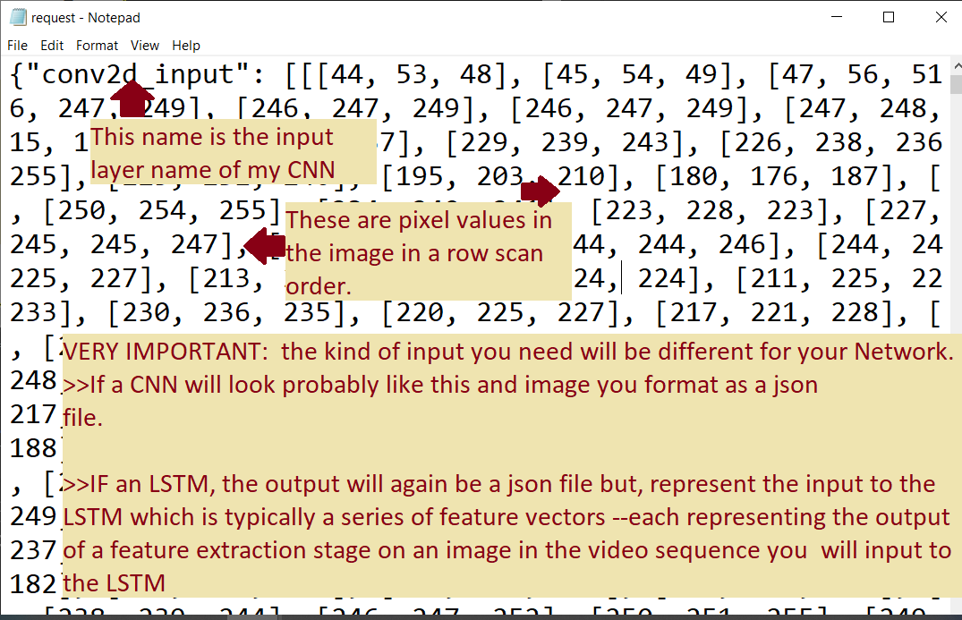 Example for CNN: If your input is a raw image, resize it and then use the pyton script (image-to-json.py which you must copy to your machine) to convert any image you want to pass to the CNN model created above for classification to a json file called request.json