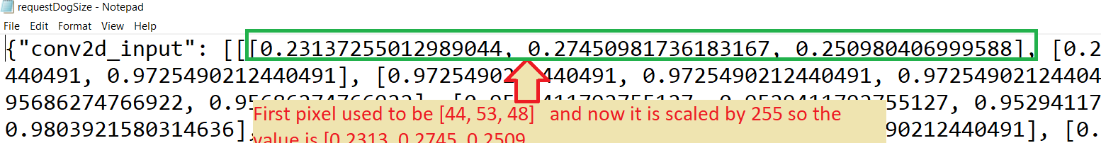 STEP 5.1 INPUT Data Format -- HERE are 2 files you can use that have been processed: requestDogSize.json and requestCatSize.jsonIMPORTANT: you must understand the input needed for your Network you deployed.>> If a CNN you will most probably be passing an image as input, but MUST MAKE sure it is the CORRECT SIZE (see example below).
