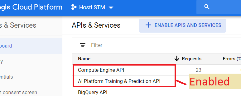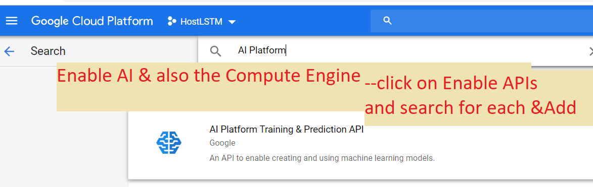 STEP 1: In dashboard for console.google.cloud you create a project AND enable theAI Platform ("Cloud Machine Learning Engine") and Compute Engine API