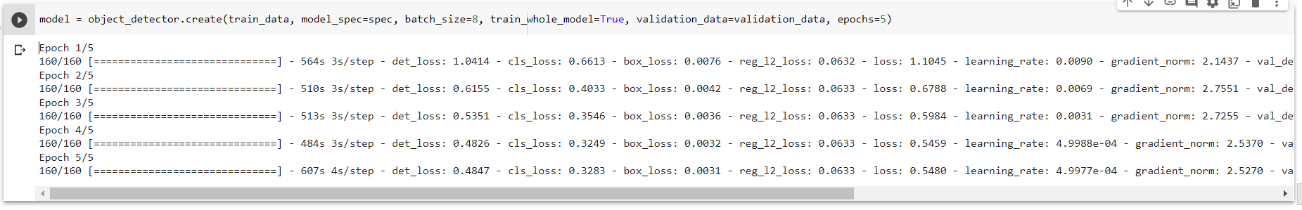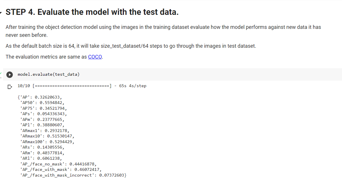 check out the new colab I made that uses the mask data and Tensorflow Lite Model MakerIt uses the data you will need to grab, unzip and put in your drive found hereYou can see it training below. I will continue to work on it after it finishes with 5 epochs to see that it runs the evaluation and testing cells in the colab. If you choose this alternative I am fine with you using the Kotlin Android sample they provide that uses the ObjectDetector class... again see the Exercise statement info.If you choose this alternative I am fine with you using the Kotlin Android sample Tensorflow provides (see below) that uses the ObjectDetector class... again see the Exercise statement info.